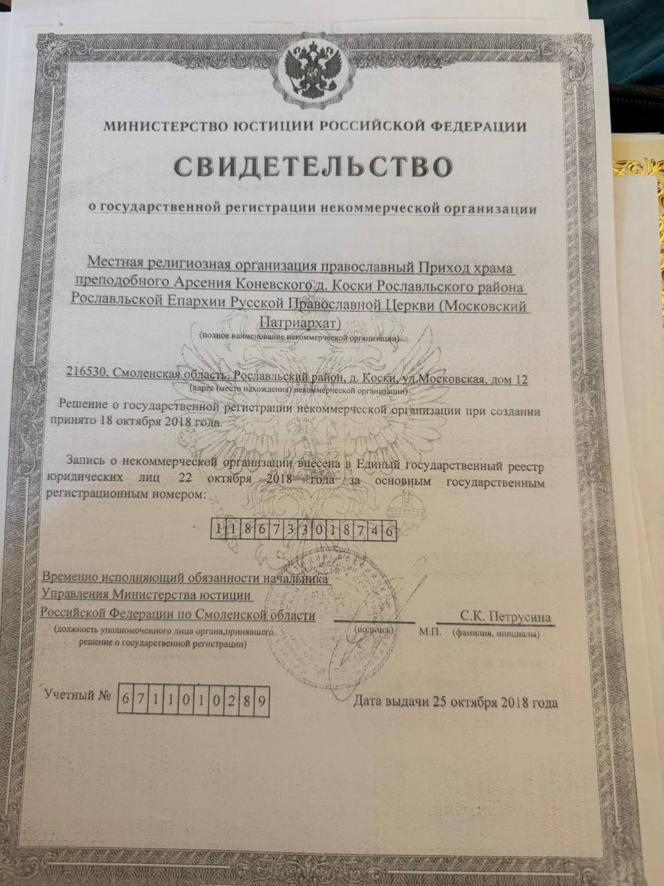 Дата выдачи свидетельства: 25 октября 2018 года