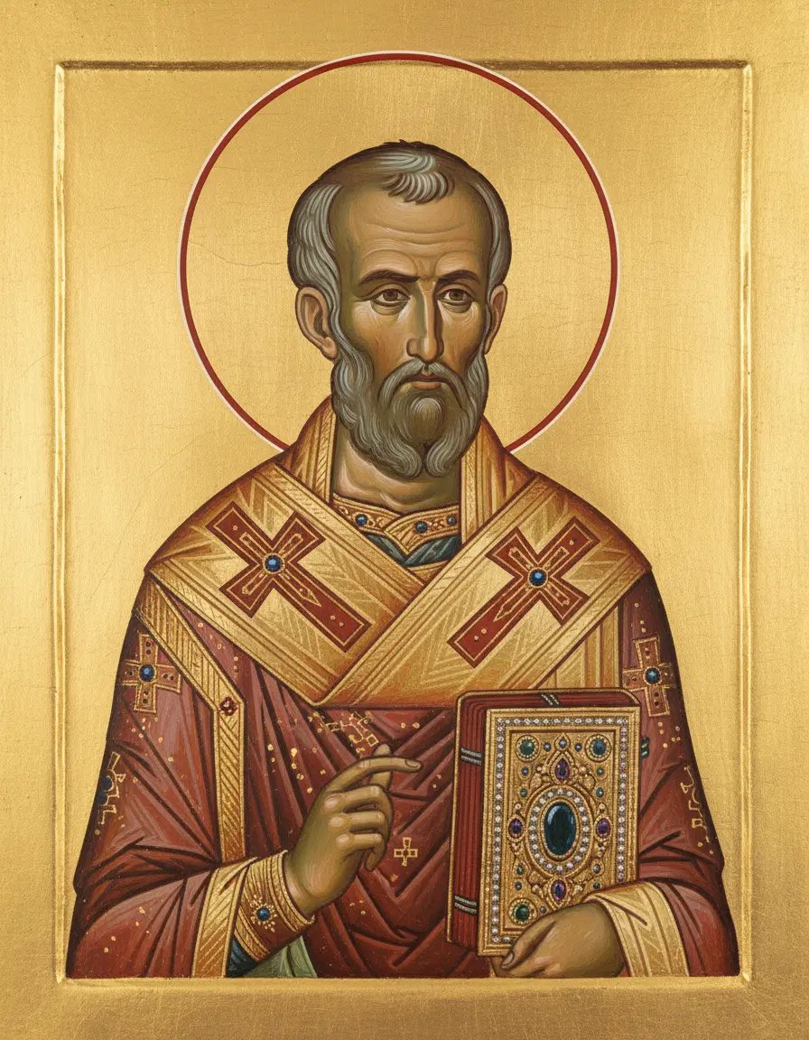 - Седые волосы и борода — святитель часто изображается в зрелом возрасте, что подчеркивает его мудрость