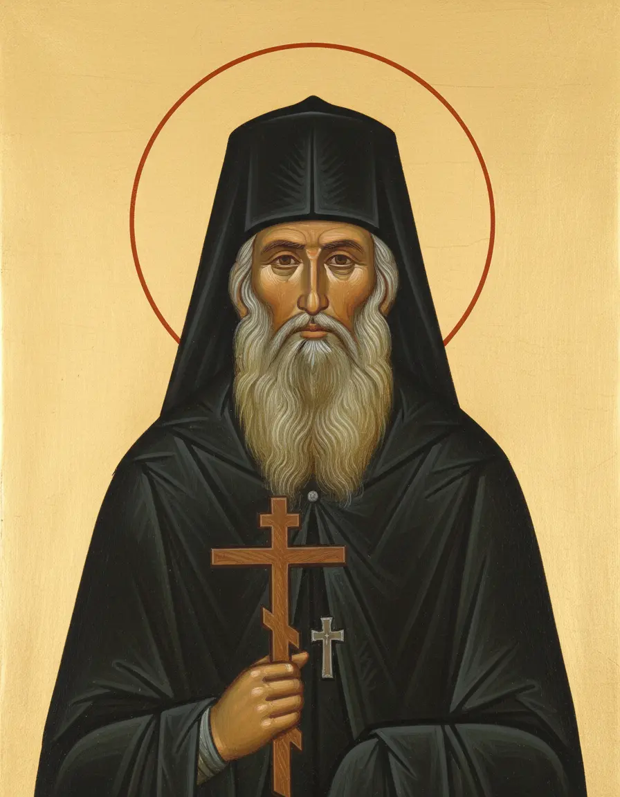 - Свиток или книга — в руках преподобный может держать свиток с молитвой или Священное Писание.